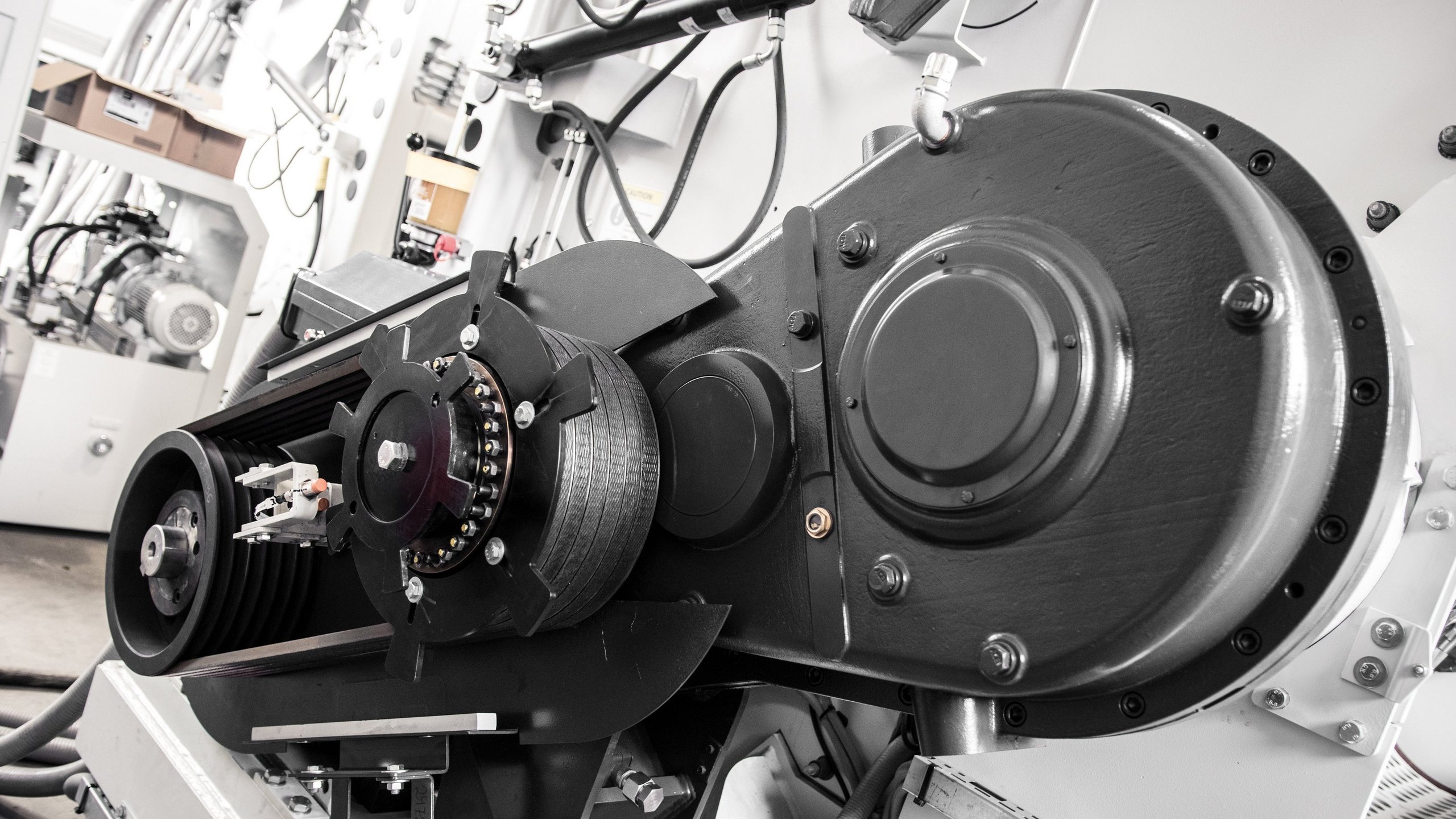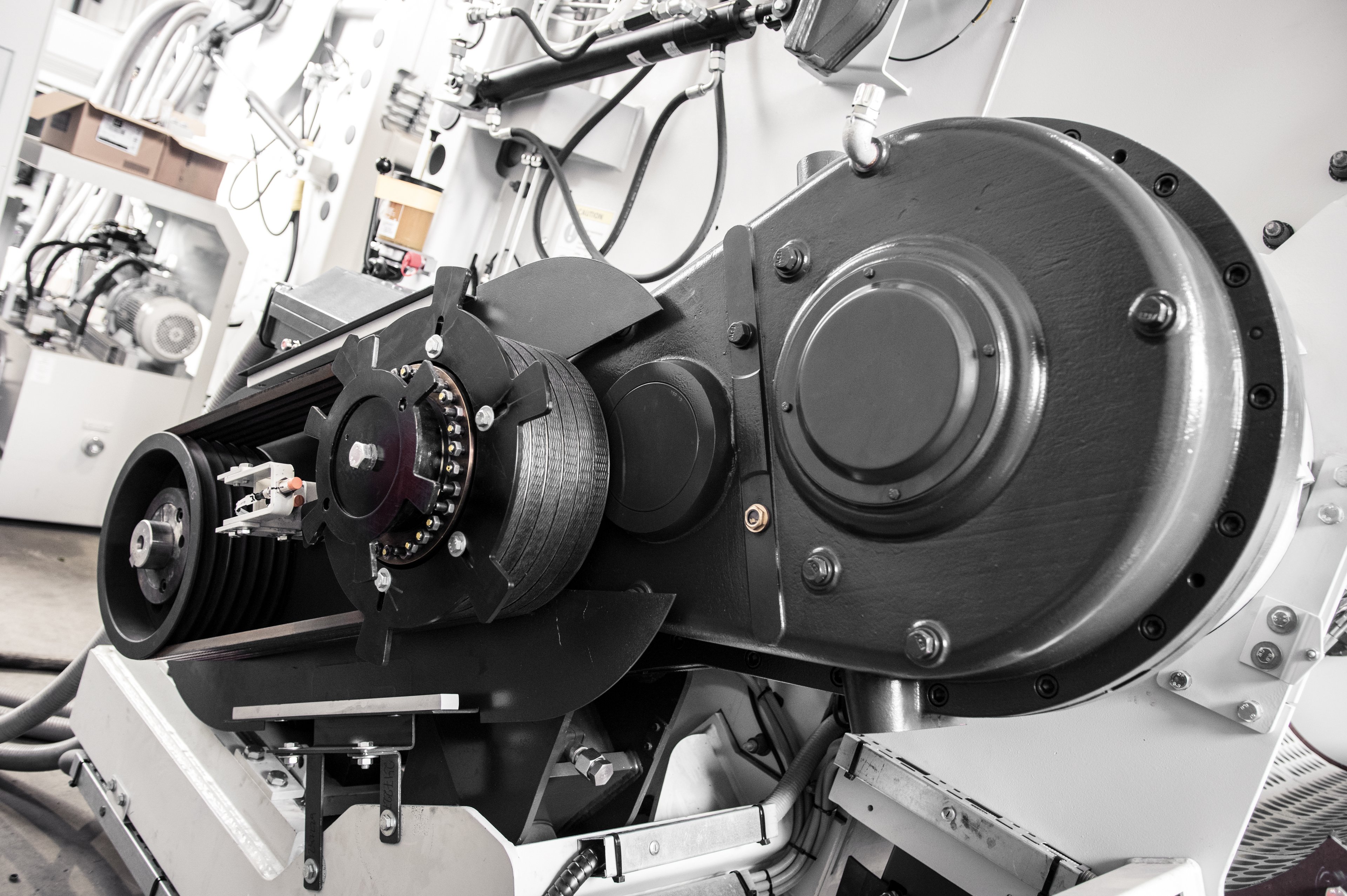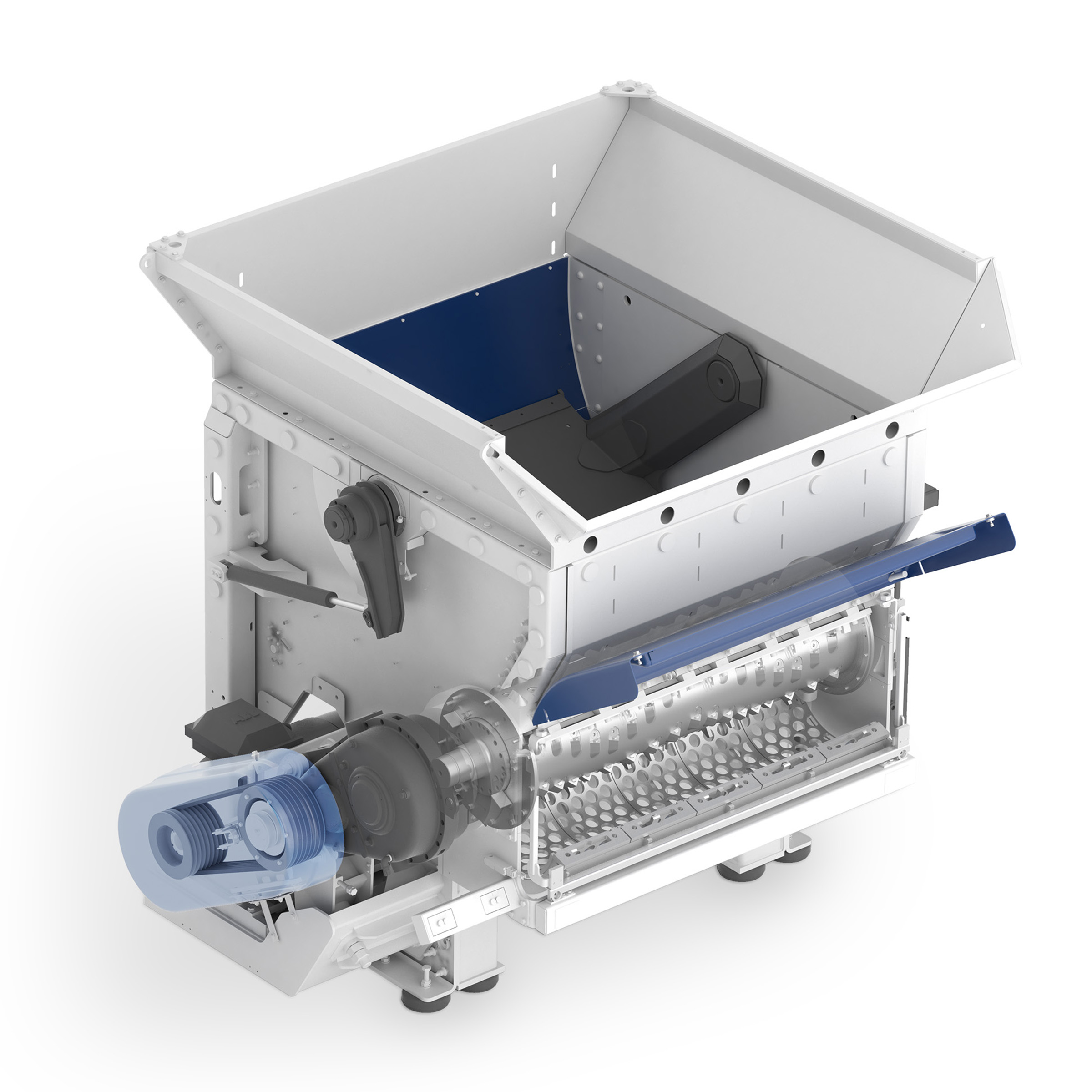 Wahlweise kraftvoller Getriebeantrieb mit leistungsstarken und bewährten Motoren für das optimale Zerkleinern von beispielsweise formstabilen Kunststoffen, Fasern, Netzen oder Bigbags – oder als Riemen-Direktantrieb (HP) für maximale Durchsätze bei der Zerkleinerung von beispielsweise Post-Consumer-Folien.