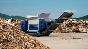 - Mobile, powerful and compact single-shaft shredder with wet-running safety clutch