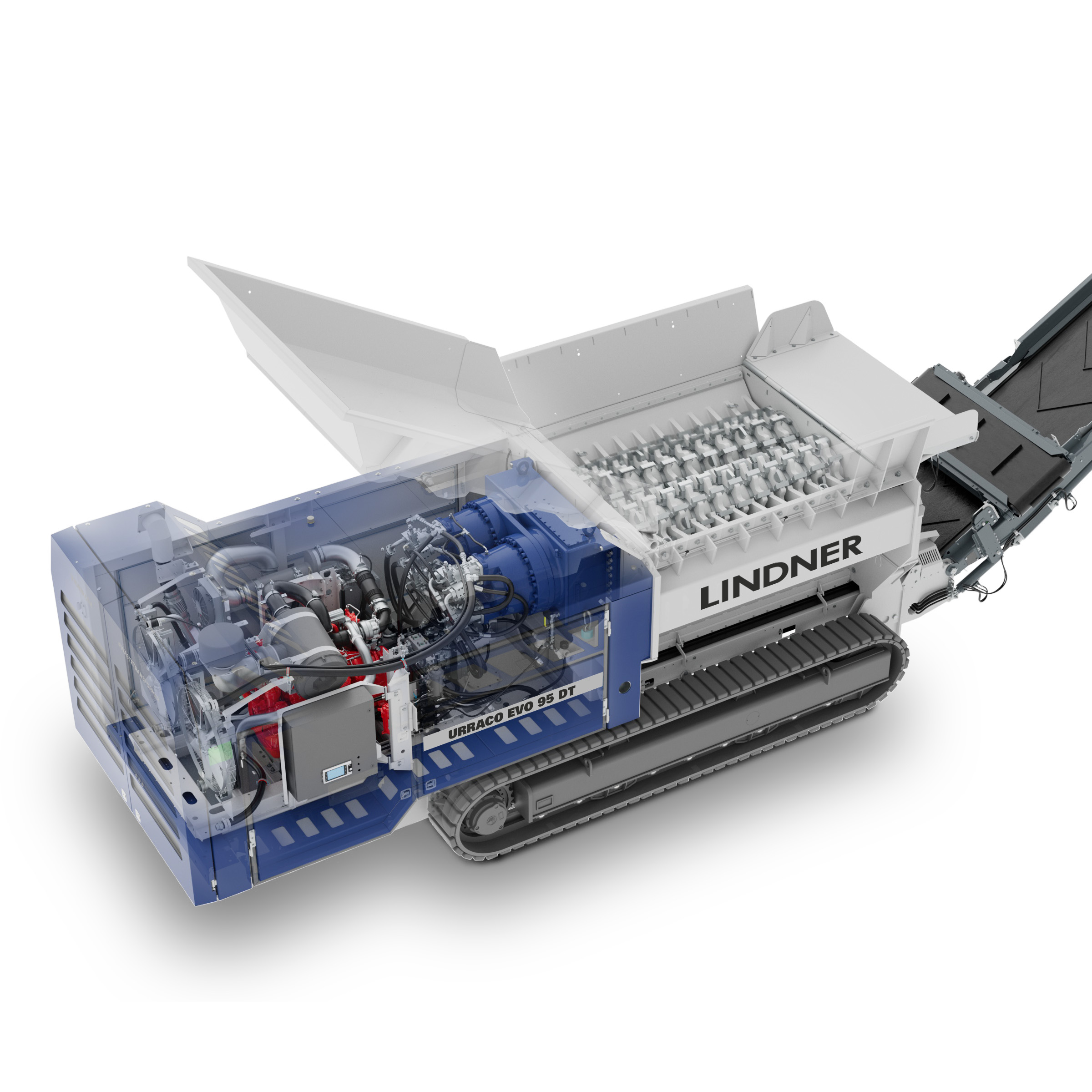 Urraco Evo is Lindner’s new future-oriented series of mobile two-shaft shredders. New to the market, this series scores highly with even more power, a speedier fast-exchange function and the well-known shaft versatility. Whether the assignment is pre-shredding or reducing volume, the focus is not just on wood, plastics, domestic and commercial waste but intentionally also on heavy-duty applications such as scrap metal, mixed scrap and aluminium.
